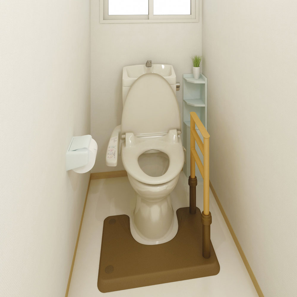 便器の素材からフレームで挟み込むタイプの手すりは設置不可でしたので、据え置き型の手すりを選定しました。片手すりでは立ち座り動作が安定しないため、両手すりにすることでバランスが取りやすくなります。