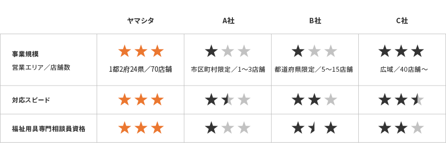 福祉用具レンタル業界最大規模となる30年の歴史と全国70以上の拠点、即日対応するための365日フォロー体制※、1,000名以上の福祉用具専門相談員の在籍といった、ヤマシタが選ばれる理由をご説明します。