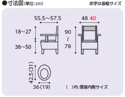 | サイズ | 幅48×長さ55.5~57.5×高さ78~90cm(便座内寸:19×31cm) |
