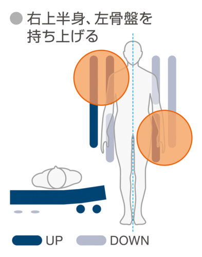 - 独立したエアセルが5分毎に膨張収縮を繰り返し、身体の保持面が切り替わります。