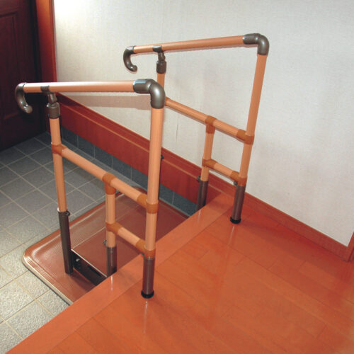 - 玄関に置くだけで補助手すりが構築でき、あがりかまちの昇降をサポートいたします。