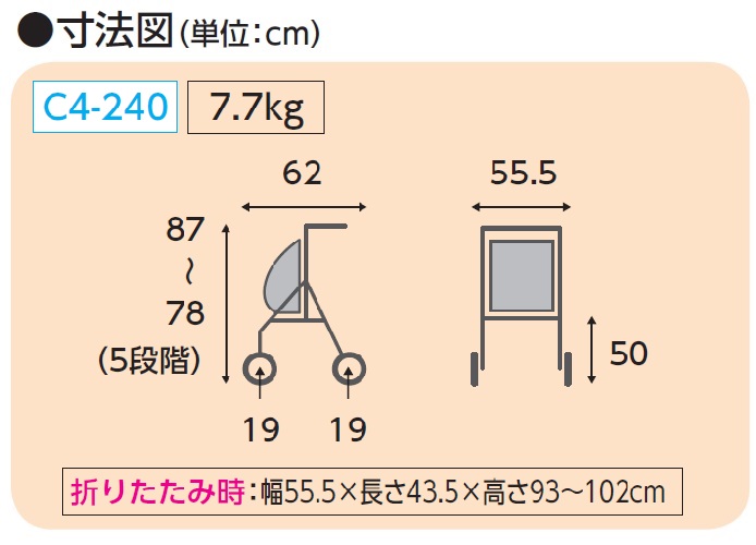 | 折りたたみ時 | 幅43.5×長さ62×高さ78~87cm |
