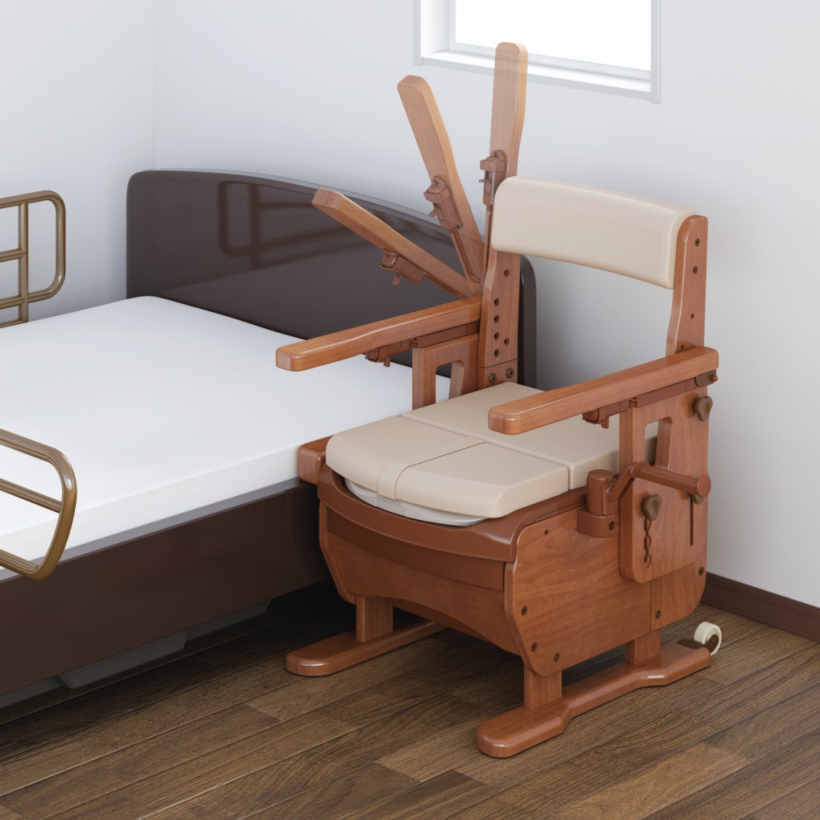 ご利用者の身体状況や住環境に合わせてセレクトできるポータブルトイレです。移乗に便利なひじかけはねあげタイプ。