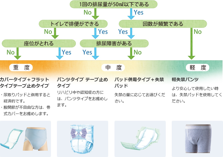 おむつにはいろいろな種類があります。排泄物の量や頻度、介護の状況などに応じて、適切なタイプのおむつを選びましょう。(左右にスライドしてください)