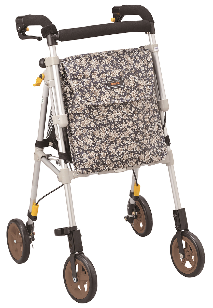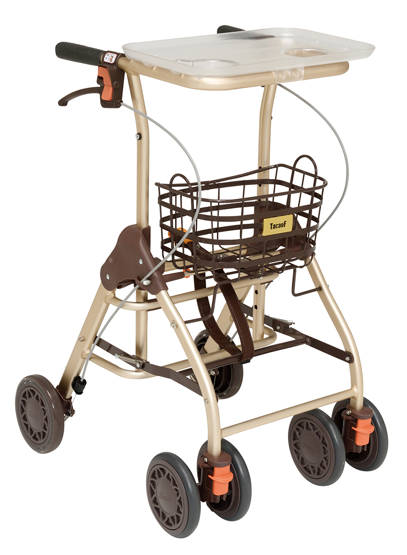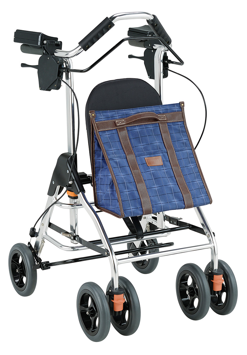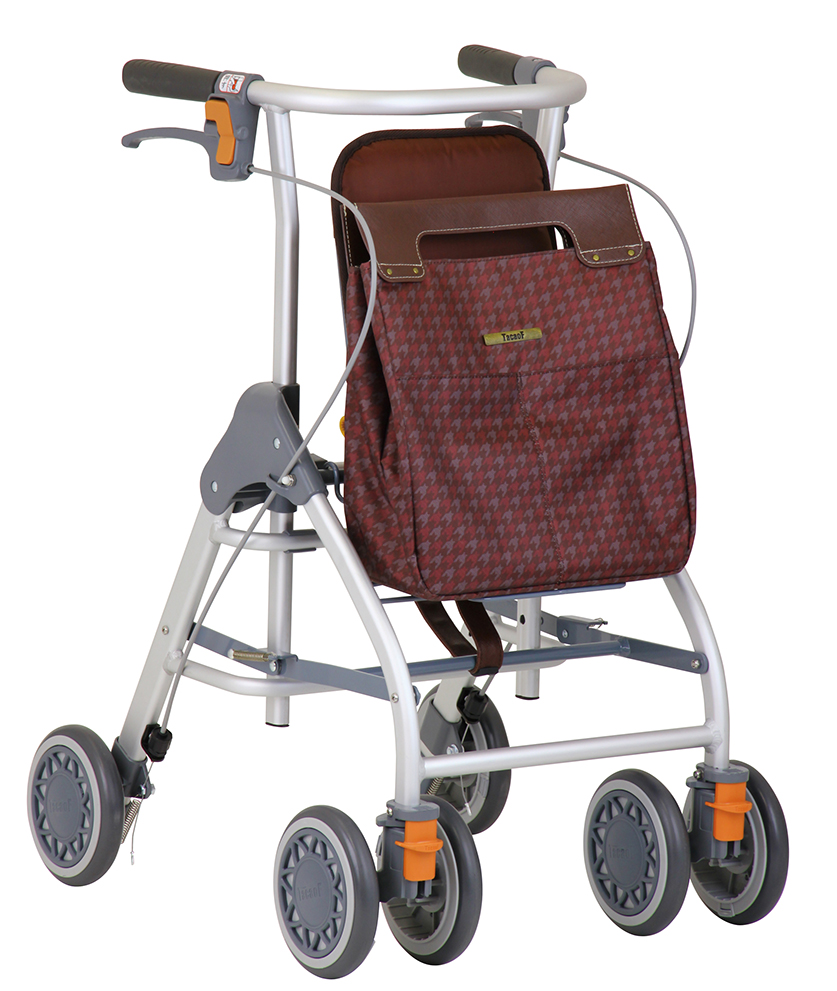 片方だけのブレーキ操作でも両後輪を制御できるコンパクトで使いやすい歩行器です。