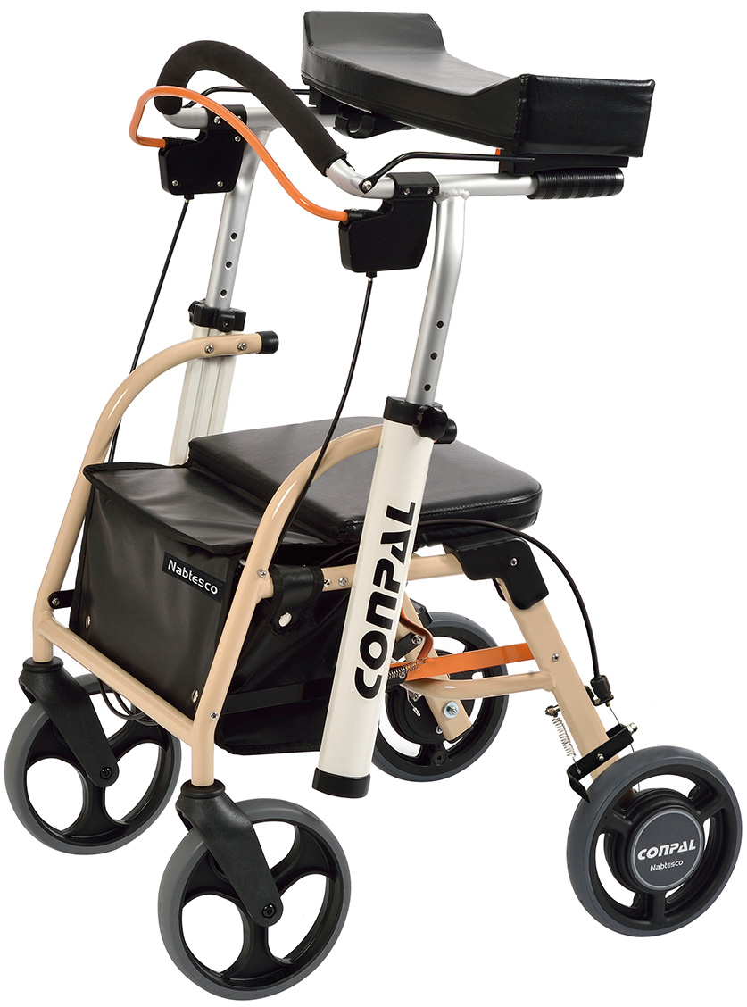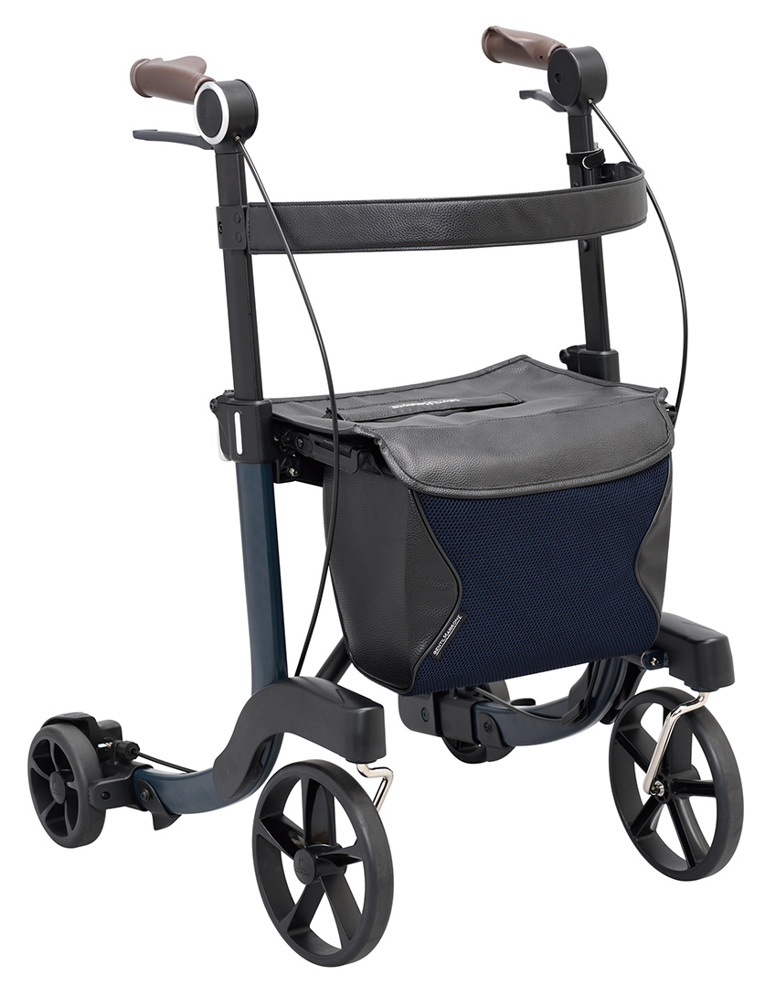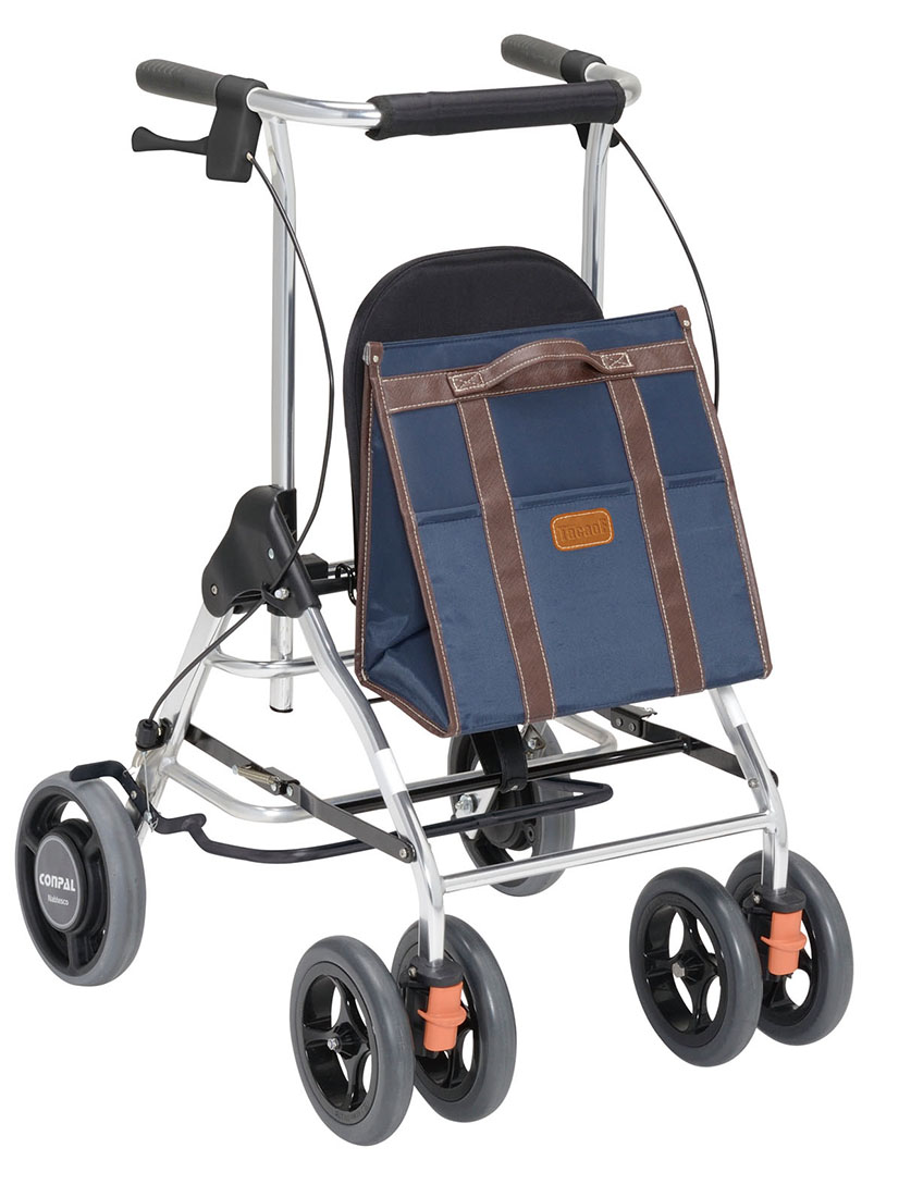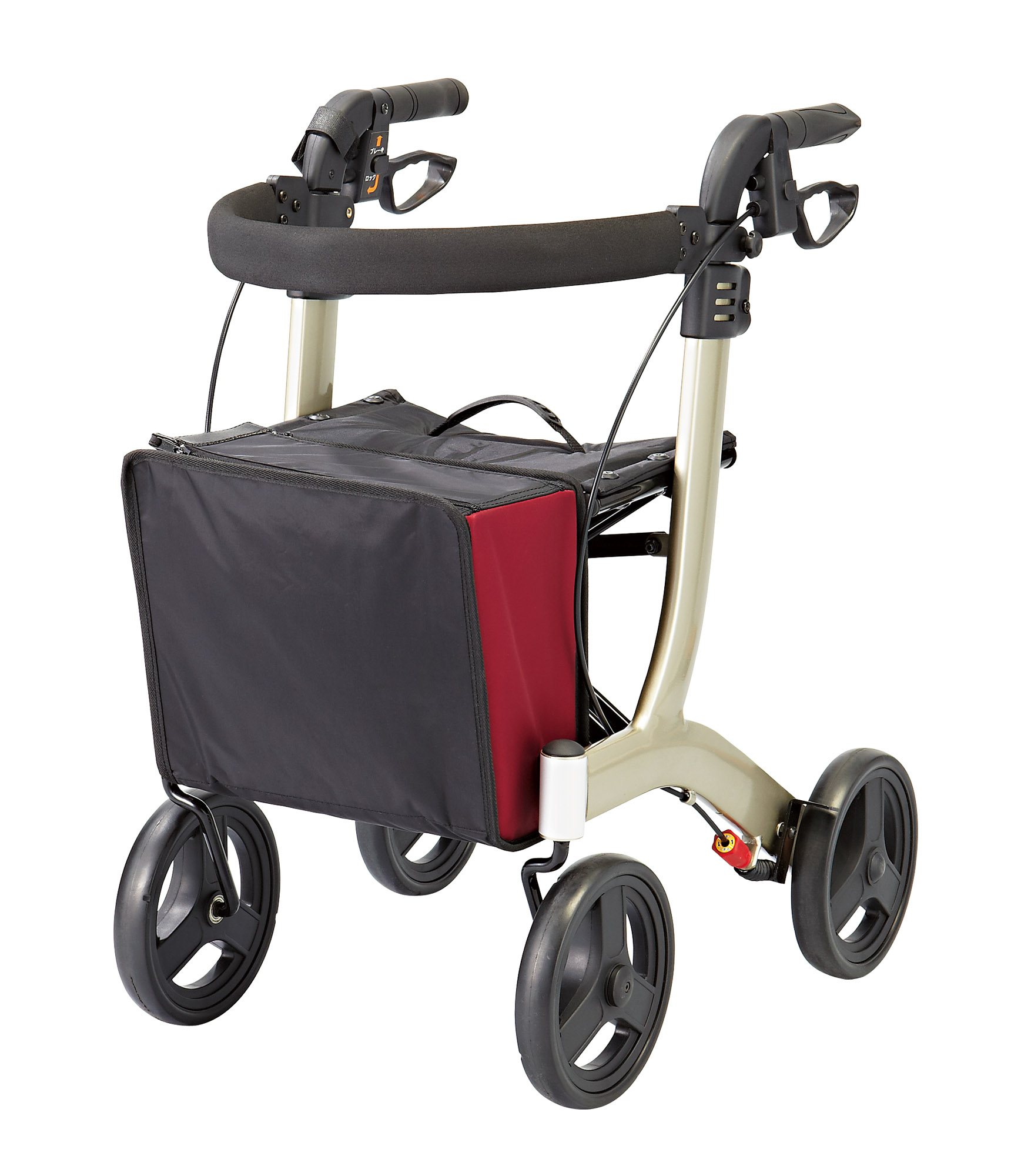 片方だけのブレーキ操作でも両後輪を制御できるコンパクトで使いやすい歩行器です。