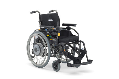 スリム設計で操作性に優れた電動車いす。 介助者による電動操作が可能なタイプもあります。